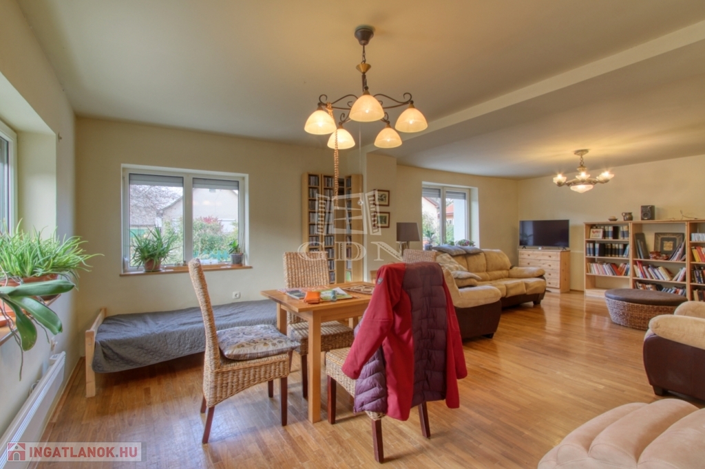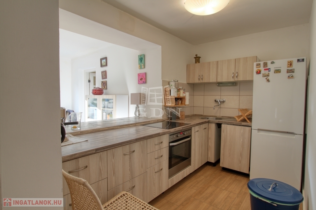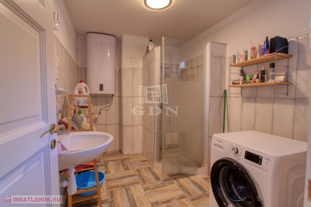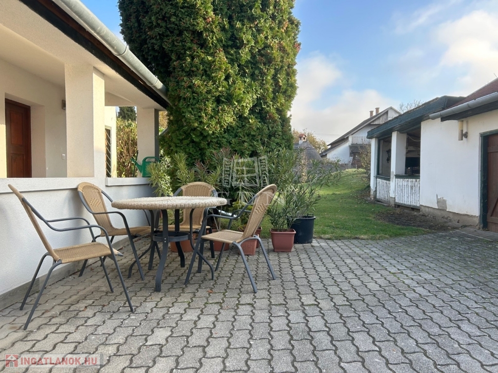 A ház 37 m2-es nappali-étkező, előszoba-étkező, konyha, fürdőszoba, wc, közlekedő helyiségekből áll. További hálószoba leválasztással kialakítható, illetve a verandáról nyíló jelenleg tároló funkciót ellátó helyiség is alkalmas lehet szoba kialakítására. Az épülethez csatlakozik egy tároló és egy 20 m2-es terasz, illetve a ház mellett található egy külön épület, fedett kiülő és pince. A kert gondozott, öntözése ásott kútból lehetséges. Ár: 82 MFt