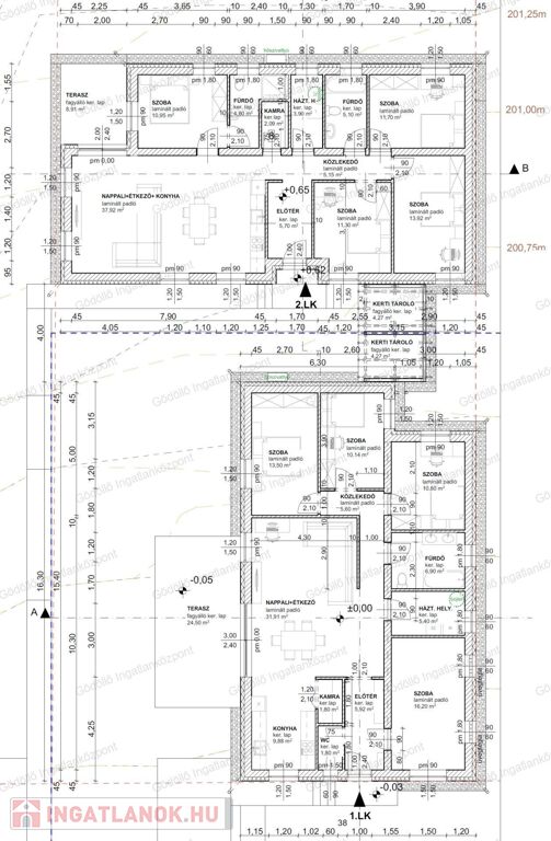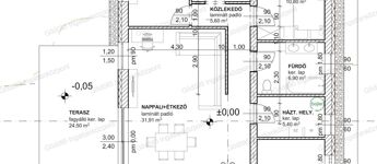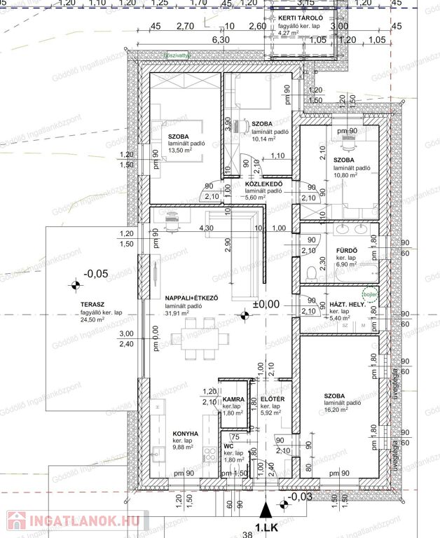 - előtér, nappali-konyha-étkező, kamra, közlekedő, 4 szoba, fürdő, háztartási helyiség + 8,91nm terasz + 4,27nm kerti tároló