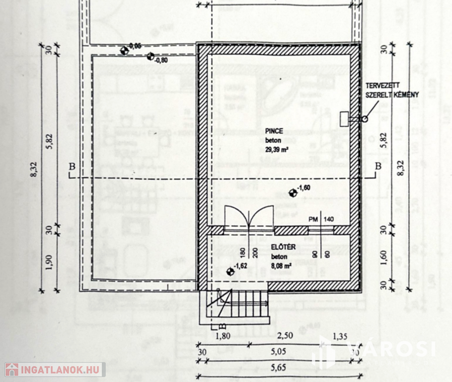 A házhoz tartozó 37,5 m²-es pince (29,39 m² pince + 8,08 m² előtér) külső lejáratos, kiválóan alkalmas tárolásra, műhelynek vagy akár borospincének.