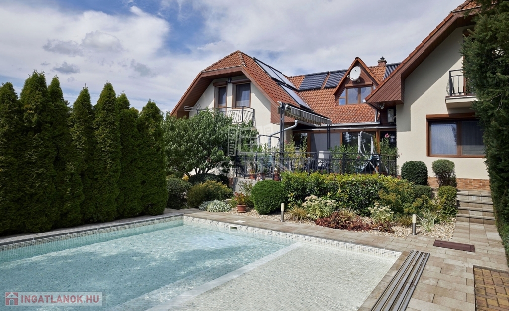 Kertben öntöző rendszer telepített, örökzöld növényekkel parkosított, melyben egy fedett, fűthető úszómedence található.