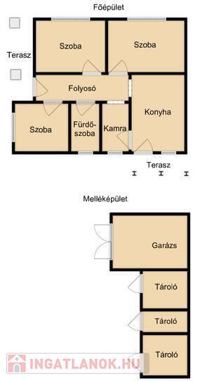 - Az épület helyiségei: 3 szoba, folyosó, fürdőszoba illemhelyiséggel, konyha, kamra, 2 terasz.