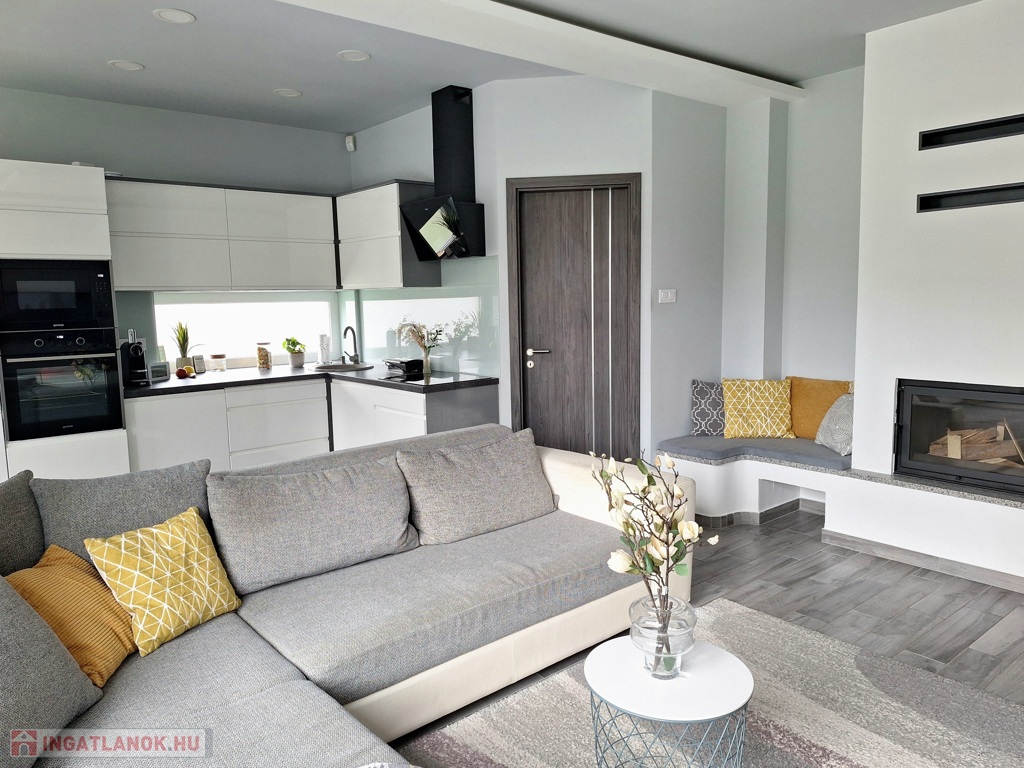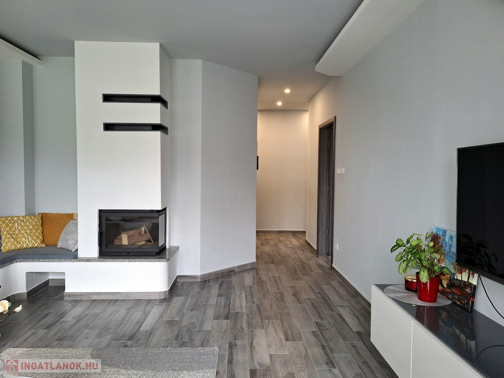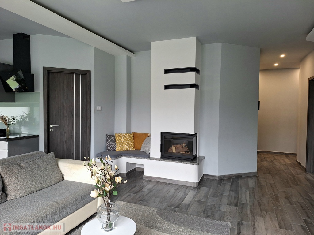 A tágas nappaliban található egy fa tüzeléses kandalló is, mely nemcsak látványként használható.