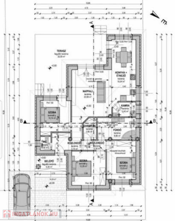 ELOSZTÁSA: közlekedő, nappali-étkező-konyha, kamra, 3 szoba, gardróbszoba, fürdőszoba, terasz.