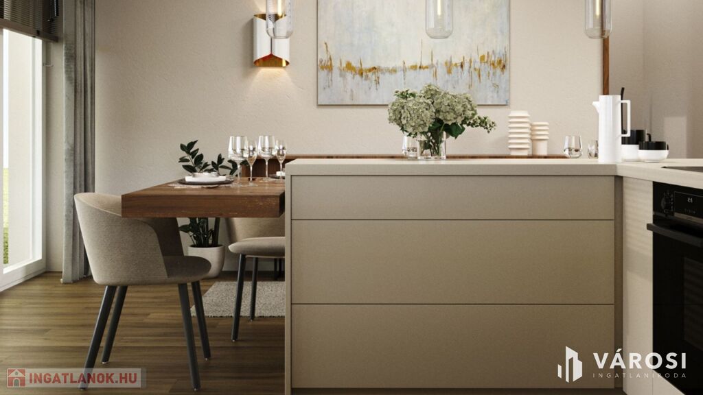 A hirdetésben szereplő látványtervek jól mutatják, milyen otthonosan berendezhető, jól élhető lakás lesz belőle.