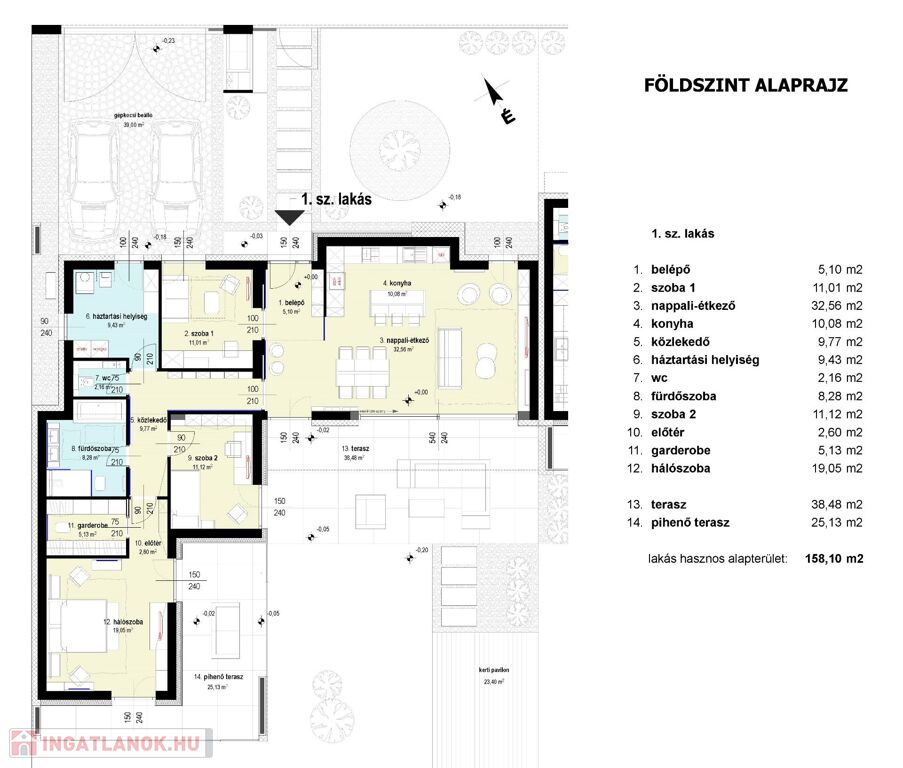 A földszintes, remek elrendezésű, ideális -DNY-i- tájolású nappali+3 hálószobás lakás nettó hasznos lakóterülete 126,29 m2, melyhez összesen 63,61m2 terasz és egy 39 m2 alapterületű dupla gépkocsibeálló tartozik, 585 m2 önálló saját telekrészzel.