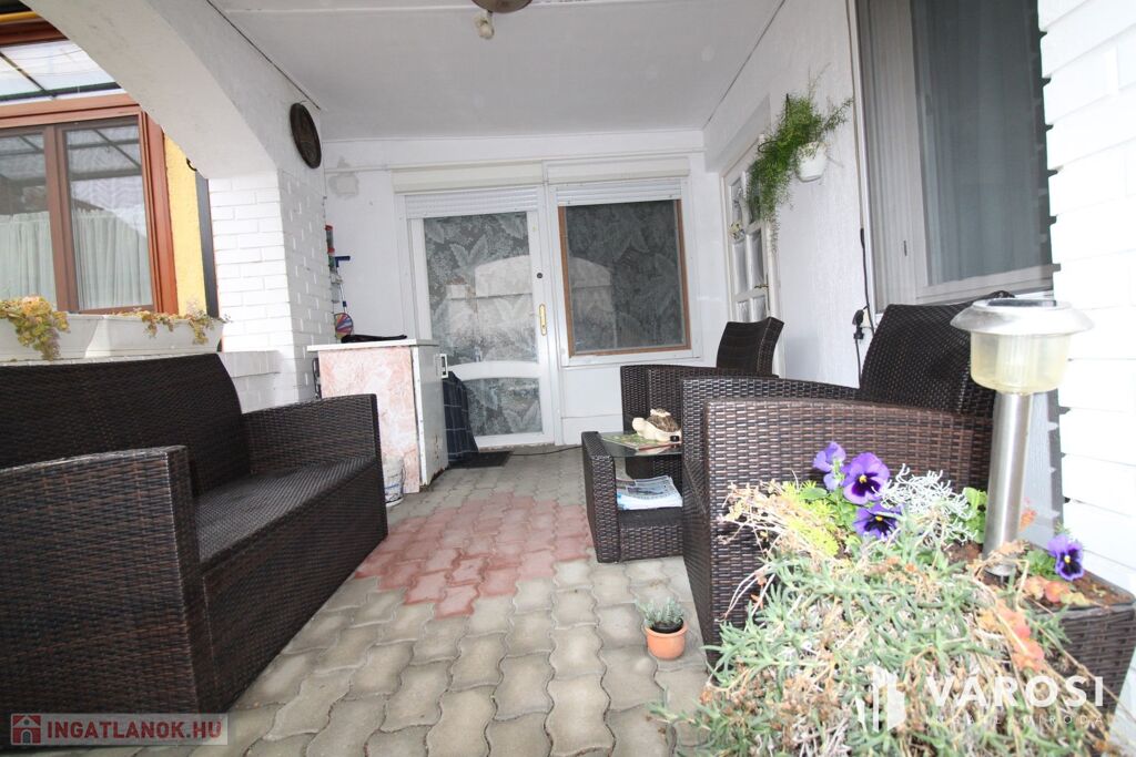 Tartozik hozzá egy fedett terasz is. Az udvaron kerti csap biztosít locsolási lehetőséget.