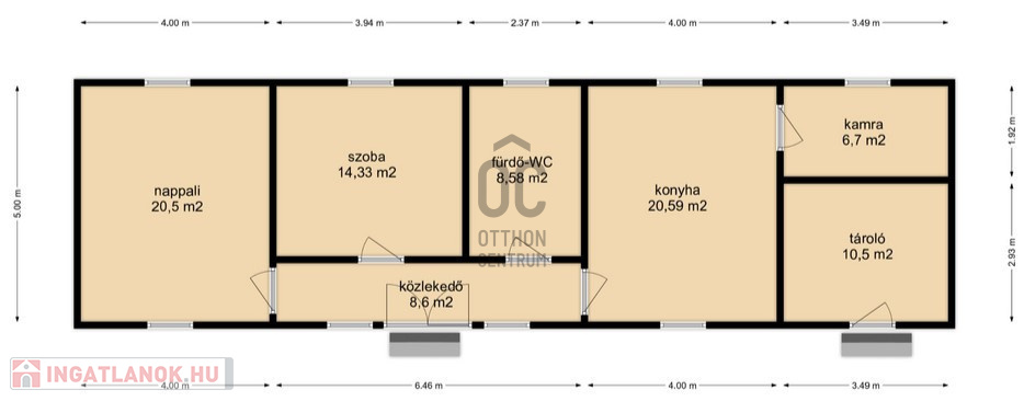 - A házban kettő tágas szoba, konyha, fürdőszoba-WC, kamra, közlekedő, tároló került kialakításra.