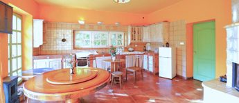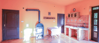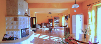 -a földszinten a 4,5 méteres belmagasságot álmennyezettel – gipszkartonnal 2,9 méterre csökkentették, ezáltal kedvezőbb fűtési lehetőséget teremtve. A falak vastagsága 70 cm, így a ház szigetelése nem szükséges.