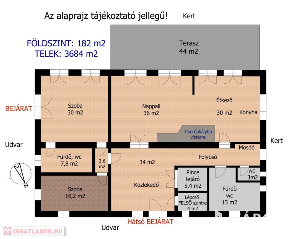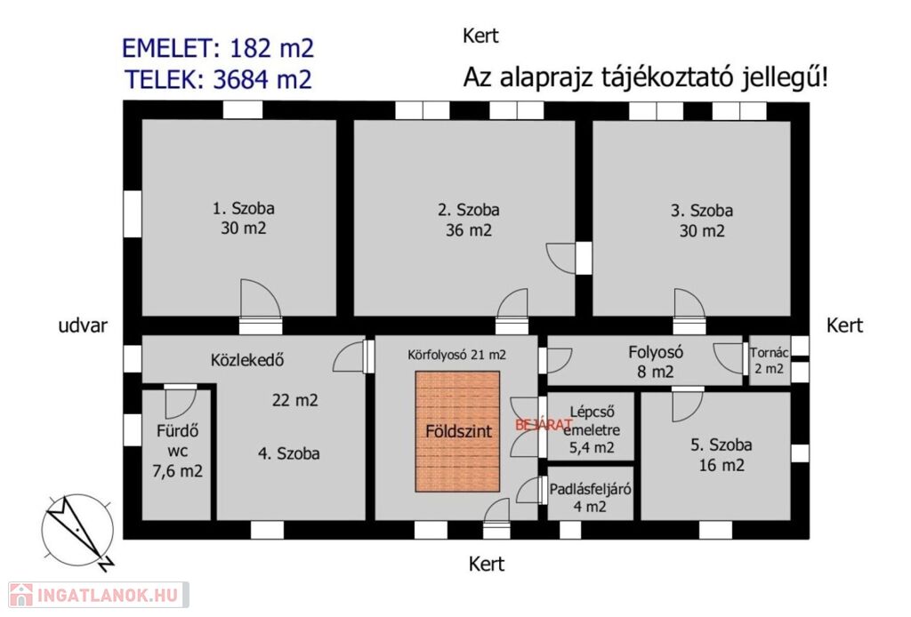 A jelen hirdetésben rögzített, az ingatlannal kapcsolatos adatok, információk az Eladó/Megbízó tájékoztatása alapján kerültek meghatározásra.