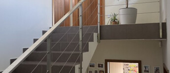 Az előtérből pár lépcsőfokon át a 3 szobát + fürdőt tartalmazó szintre juthatunk.