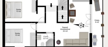 Az emeleten egy nappali jellegű közösségi tér, 2 külön nyíló hálószoba és egy tusolós fürdőszoba került kialakításra, így akár több generáció vagy vendégek fogadására is alkalmas lehet.