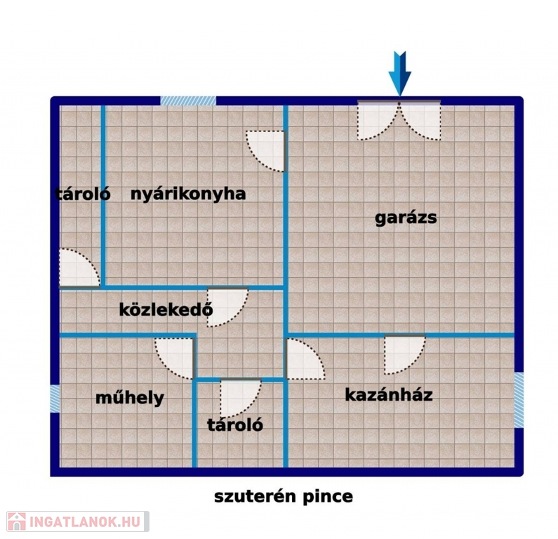 A szuterén szinten kapott helyet az egyik garázs, pince, nyári konyha és a kazánház.