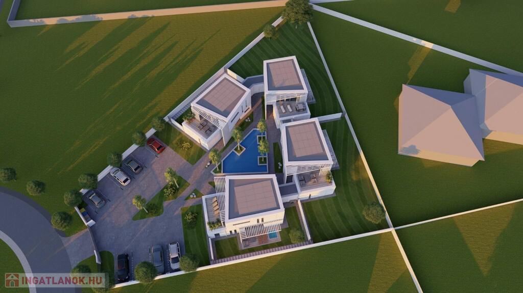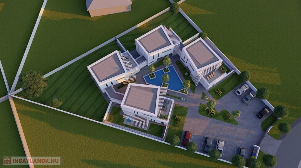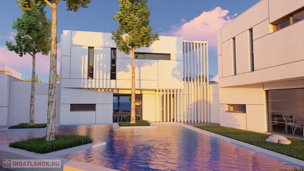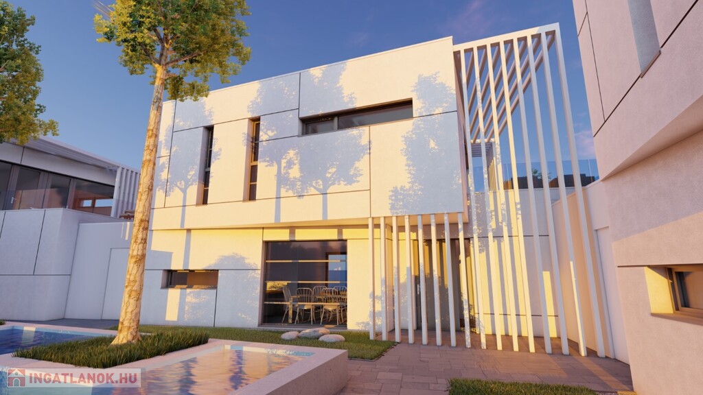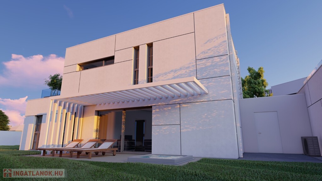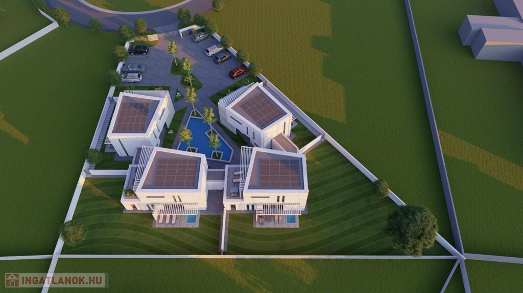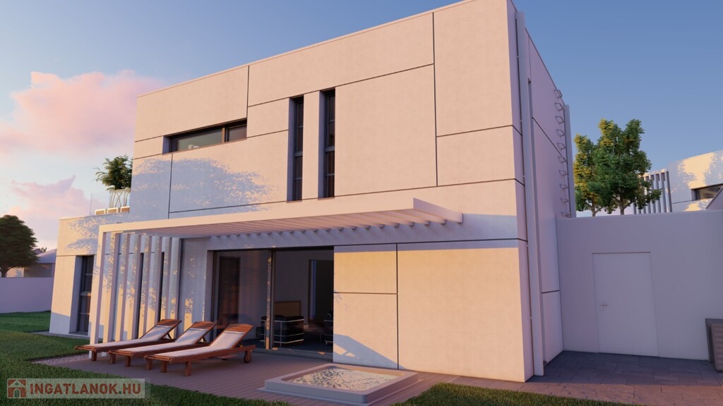 Kaposváron a Kisgát városrészben, a Reményik Sándor utcában, modern környezetben lévő, új építésű, exkluzív - magas minőségben kivitelezett, korszerű építőanyagokból épülő 4-lakásos Villaparkban - 123,92 m2-es kétszintes családi ház eladó. A lakóház földszintjén (75,72 m2) előszoba, nagy üvegportállal rendelkező tágas nappali - étkező, konyha, 1 szoba, gardrób, fürdőszoba-wc, további wc, gépészeti - tároló helyiségek kerültek kialakításra, továbbá tartozik hozzá egy 20,70 m2-es fedett, belső udvar felé néző terasz is - süllyesztett jakuzzival. Az épület felső szintjén (48,20 m2) előszoba, 2 szoba, fürdőszoba-wc és háztartási helyiségek, illetve 20,77 m2-es nyitott terasz vannak. A korszerű, modern energetikájú - alacsony rezsivel rendelkező - épület villany ellátása H tarifával megoldott, a fűtése LG típusú hőszivattyúval kerül kivitelezésre, továbbá fan-coil rendszer biztosítja a helyiségek fűtését és hűtését. Távirányítással működő zsaluziák lesznek felszerelve, illetve prémium minőségű szaniterek és szerelvények, illetve csapok - Wellis, illetve HansGrohe - kerülnek beépítésre. Az igényesen kialakított udvaron tartozik a lakáshoz 1 db fedett gépkocsibeálló és további 1 db kocsibeálló. Az épület teljes kivitelezését - és várható 2026. III. negyedévben történő átadását - követően a - komoly referenciákkal rendelkező - beruházó végzi majd a Villapark közös költséggel járó üzemeltetését is. A lakáshoz tartozó önálló udvar mérete: 250,16 m2