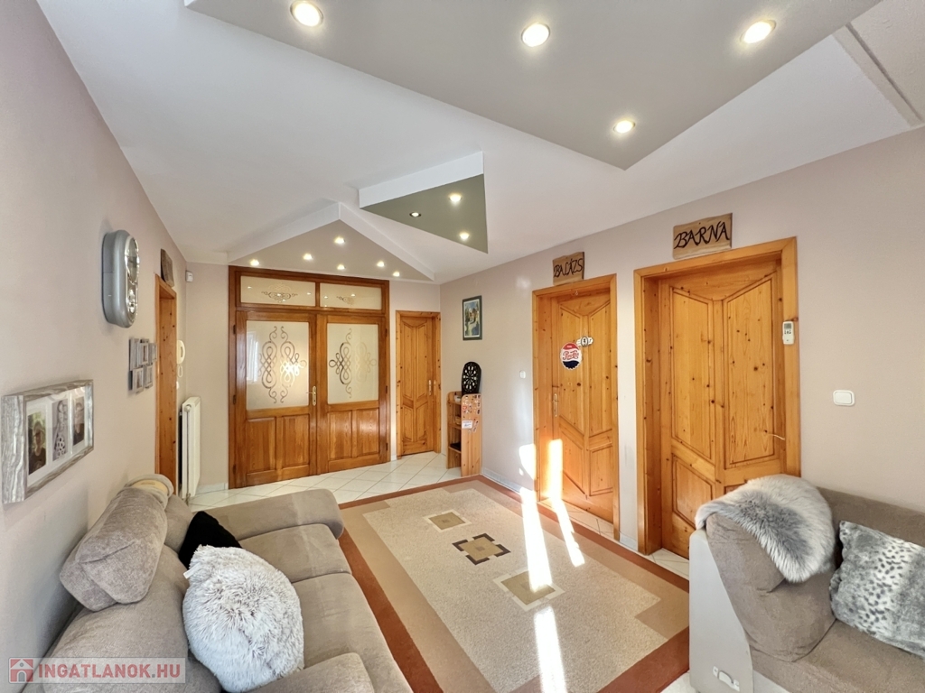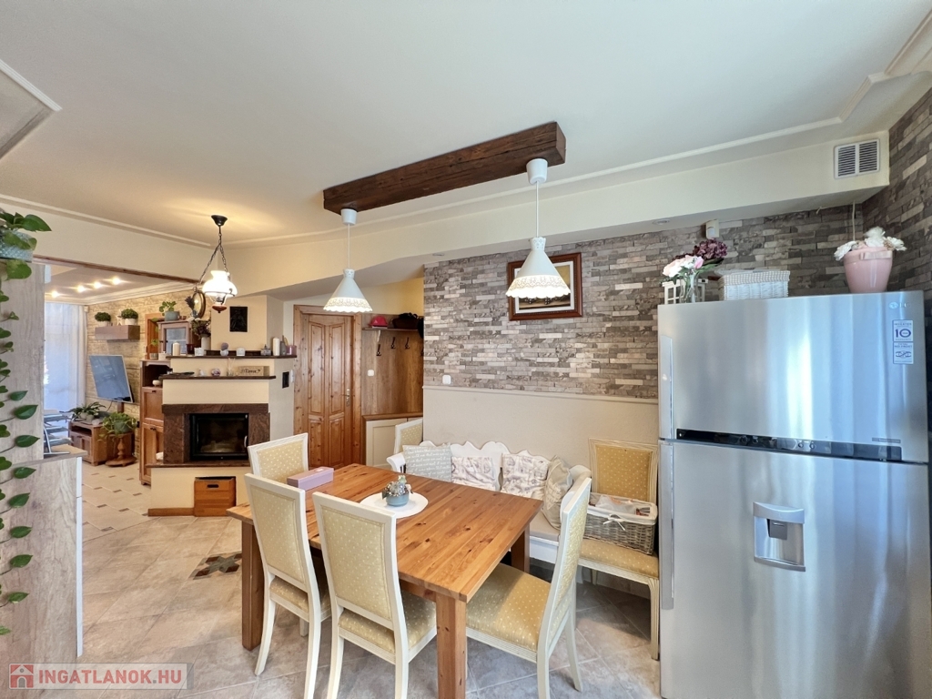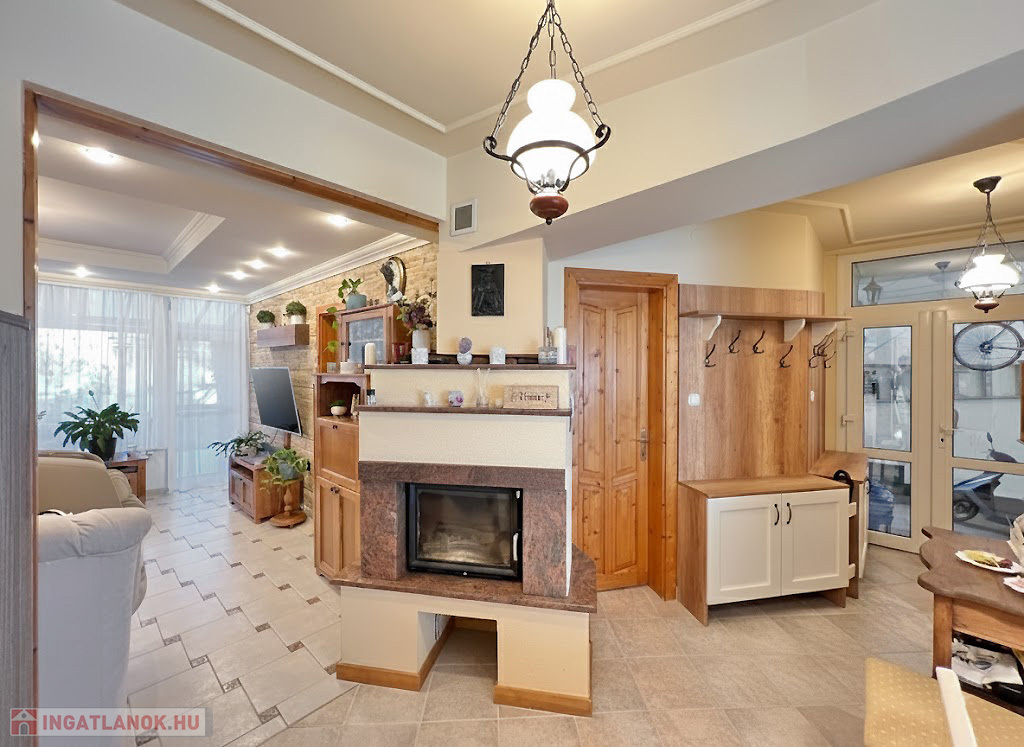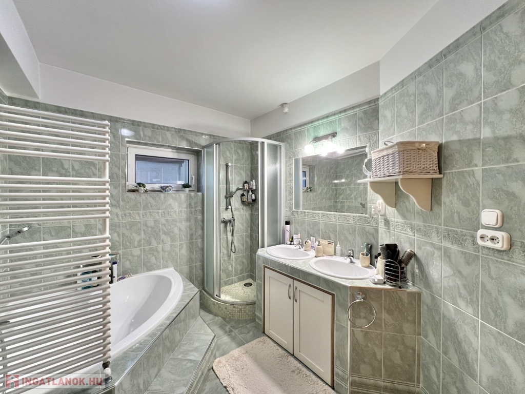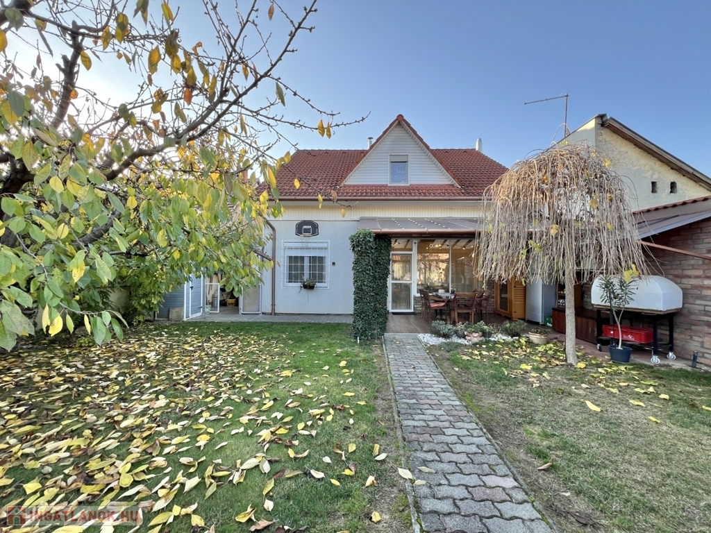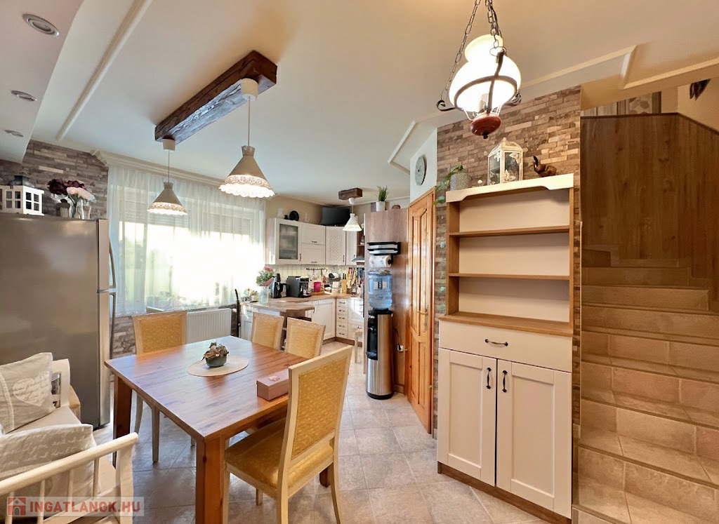 Kaposváron a Donner városrészben - a belváros közelében - 1999-ben két utcára épült, nagyon jó műszaki állapotú és energetikailag korszerűsített családi ház duplagarázzsal, valamint egy különálló lakrésszel együtt eladó. A lakóház alsó szintjén tágas - belső zárt udvar felé néző - nappali, 15 m2-es fedett terasz, 1 szoba, konyha-étkező, közlekedő, fürdőszoba-wc, mosókonyha, illetve 1 db wc helyiségek kerültek kialakításra. A tetőtérben, egy tágas előtér-terasz, 3 szoba, felújított fürdőszoba-wc helyiségek vannak. A fűtése és melegvíz ellátása kombi gázkazánnal és a nappaliban lévő vízteres kandallóval - padlófűtéssel és radiátorokkal megoldott, továbbá a nappaliban és a tetőtérben 1-1 légkondicionáló került felszerelésre. A ház energetikai korszerűsítésen esett át az évek során, a tulajdonos a homlokzatra 5 cm-es hőszigetelést rakatott, valamint új gázkazánt szereltetett fel, 3x20A, riasztó és kamerarendszer kerültek kiépítésre. Az utca felől - további 30 m2-es - jelenleg tárolónak használt - lakóépület van, amelyben 1 szoba, konyha-étkező, kamra, kialakításra váró fürdőszoba-wc helyiségek találhatóak, a fűtése Simat típusú kombi gázkazánnal megoldott. A zárt, hangulatos udvaron - a belváros felé néző - fedett grillterasz lett kialakítva, öntözőrendszer lett kiépítve, továbbá egy 36 m2-es duplagarázs-tároló, illetve az udvarban további 2 személyautónak alkalmas kocsibeálló található. Telek: 294 m2