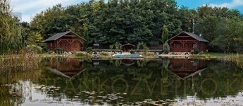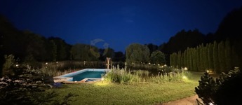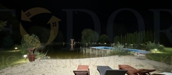 A birtok ékköve az organikus kialakítású, fűthető dísztó, melyből két vízköpő emelkedik ki.