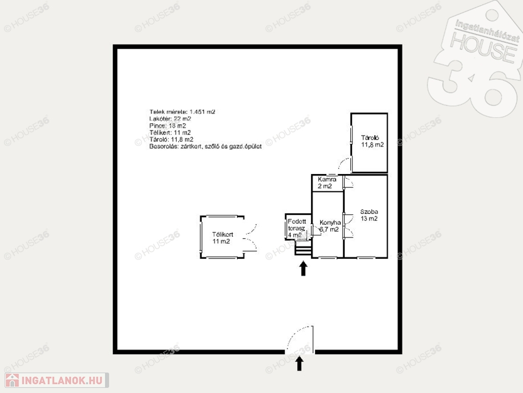 - Lakótér: 22 m2 (1 szoba, konyha, kamra)+ 4 m2 fedett terasz