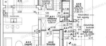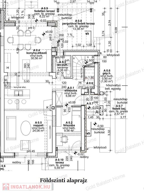 - Földszinti helyiségek: amerikai konyhás nappali 54,6 m2, szoba 9,56, előszoba 6,88 m2,Tusoló-WC 3,38 m2, háztartási helyiség 1,9 m2, lépcső 5,85 m2, bejárat 2,57 m2, teraszok 25,5 m2