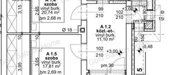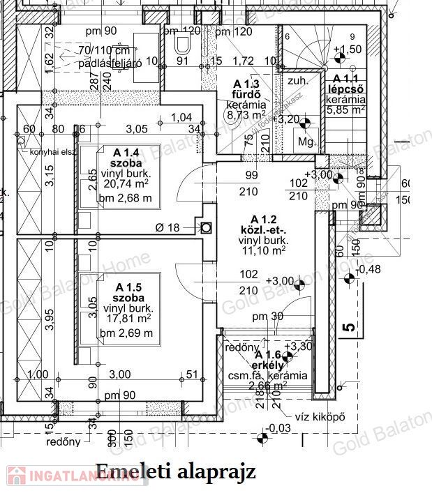 - Emeleti helyiségek: szoba 20,74 m2, szoba 17,81 m2, fürdőszoba 8,73 m2, közlekedő 11,1 m2, erkély 2,66 m2