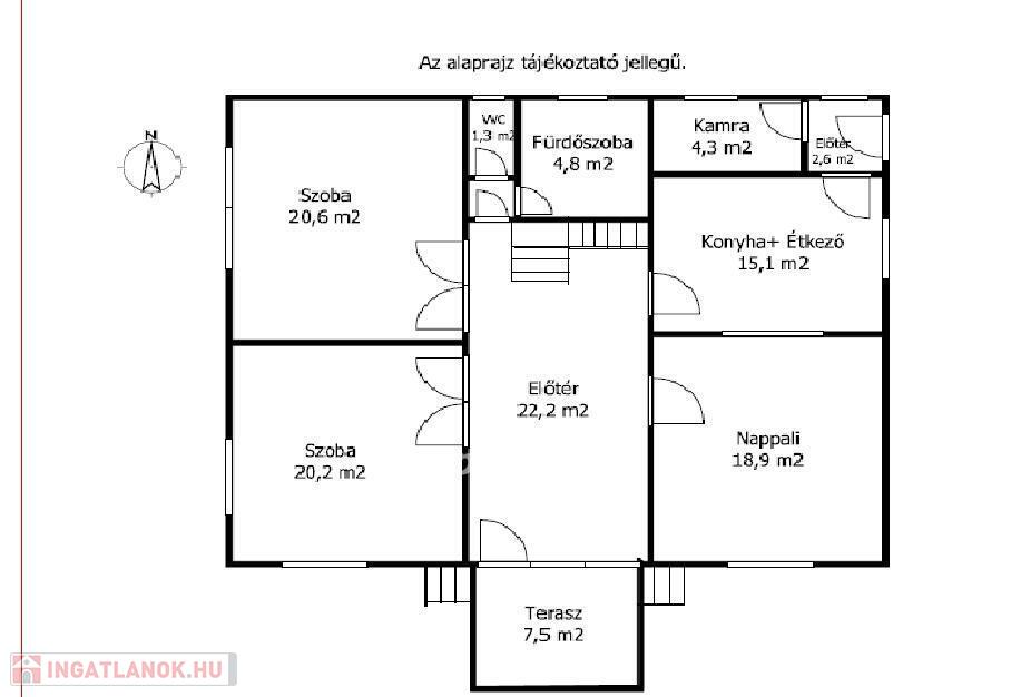 Beosztása praktikus: A tágas előtérből két szoba, konyha, nappali ( nyitott a konyhával-étkezővel ), egy kis előtéren keresztül a fürdőszoba és a WC érhető el. A konyha mellett kamra és a hátsó udvarra nyíló ajtó található. Az előtérben látható lépcső a padlástérbe vezet. A déli fekvésű bejárat előtt hangulatos fedett terasz van, melynek környezetében kerti sütő is kialakítható. Udvara tágas, sok lehetőség rejlik még benne. ( kültéri gyermekjátékok, medence...stb )