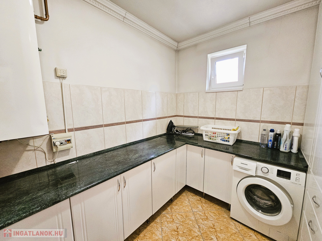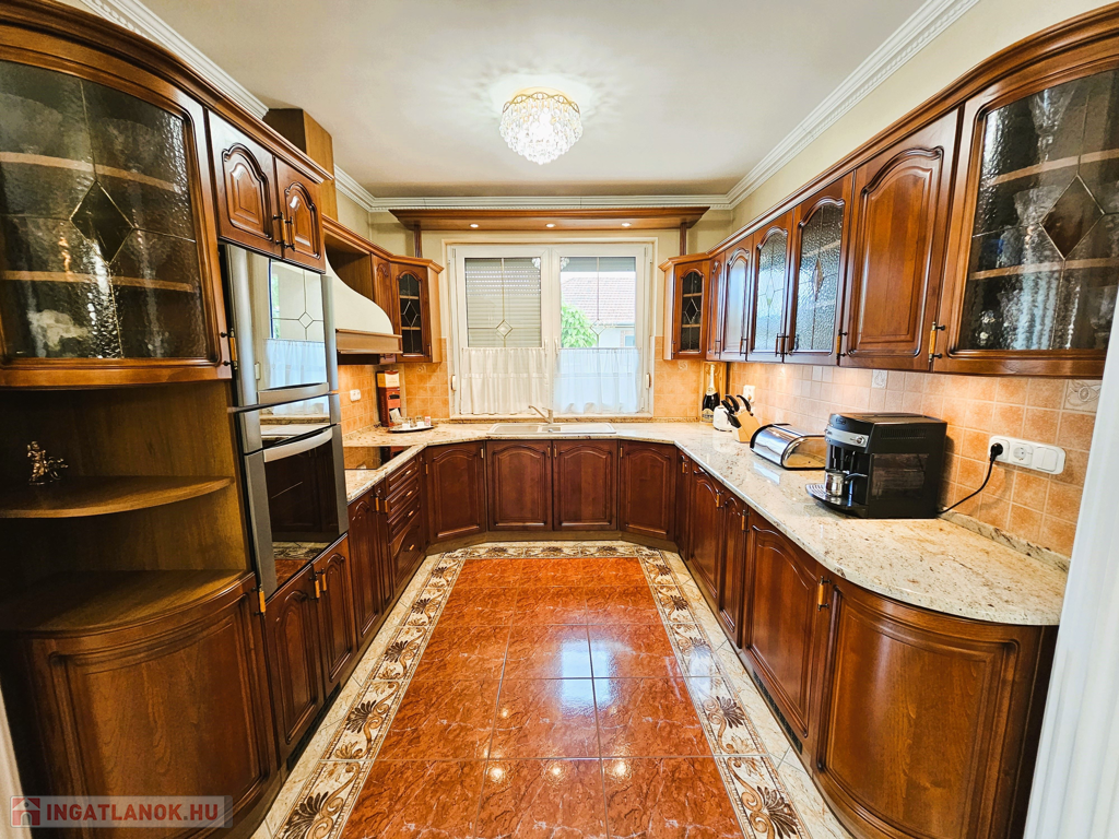 A ház fő éke a tágas, napfényes nappali-étkező, ahol tölgyfa bútorok és egységes kárpitozás teremtenek elegáns, barátságos hangulatot. A modern, cseresznyefából készült konyha gránit munkalappal és beépített gépekkel (hűtő, mosogatógép, mikró, főzőlap, sütő) felszerelt.