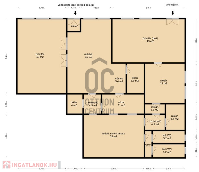- 1209 m2- es telken helyezkedik el, a kettő HRSZ számon lévő ingatlan, mely egy 130 m2-es vendéglátó egységből és egy 81 m2-es boltból áll.