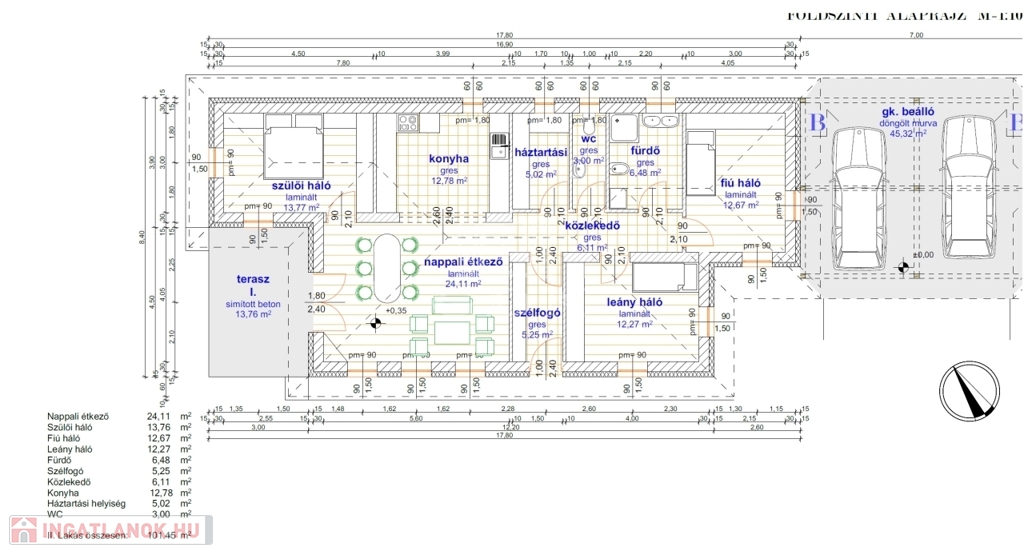 A tető héjazata betoncserép lesz, a homlokzatok 15cm EPS, a padló 10cm lépésálló, a födém 30cm ásványgyapot szigeteléssel lesz ellátva.