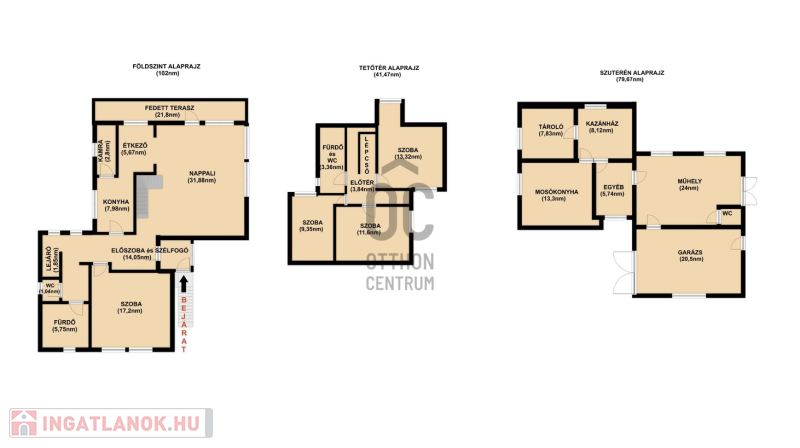 A tetőtérben három hálószoba és egy fürdőszoba+WC található.