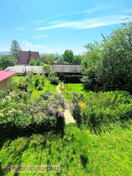 A kert rendezett, telis-tele virágokkal, dísznövényekkel, gyümölcsfákkal és a kert végében egy tároló helyisggel.