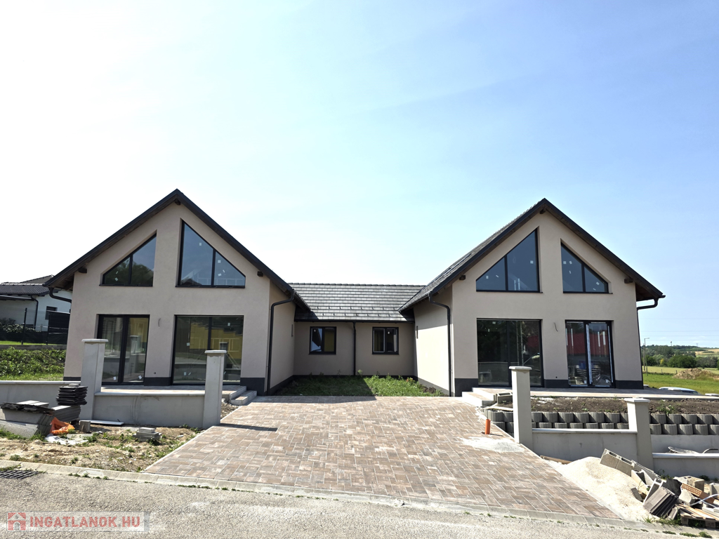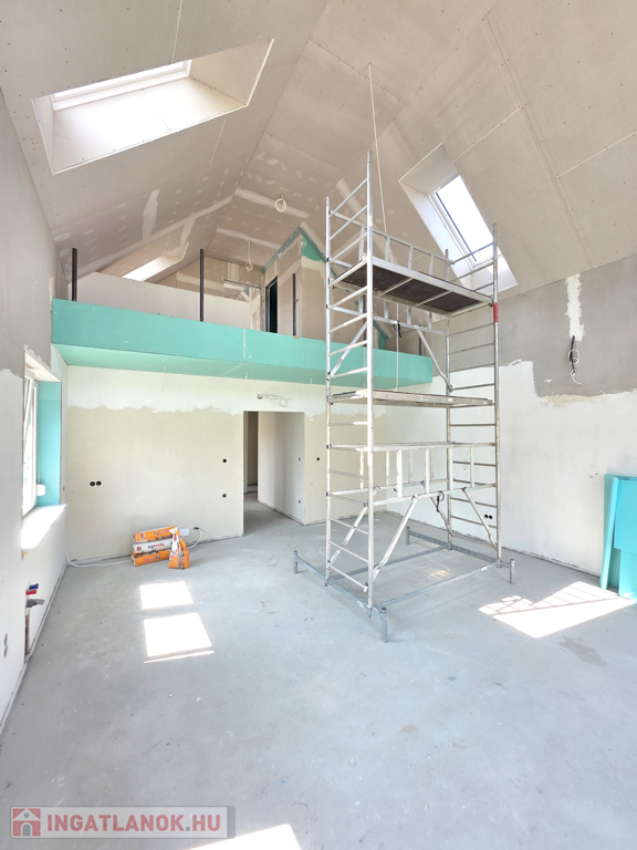 Az ikerház pár héten belül teljesen elkészül, ám leendő tulajdonosai még kiválaszthatják a belső burkolatokat, szanitereket. A házrész alapterülere 124 m2, igazán remek elosztással. 2 folyosóról nyíló hálószoba a földszinten, fürdőszoba, galériás nappali és konyha.