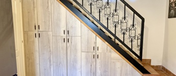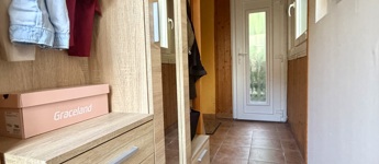 A belső terek otthonos hangulatúak és praktikusan kialakítottak: a földszinten nappali, konyha és fürdőszoba, valamint a lépcső alatti beépített tároló kapott helyet. Az emeleten hálószoba, mosdó és egy kis háztartási helyiség található.