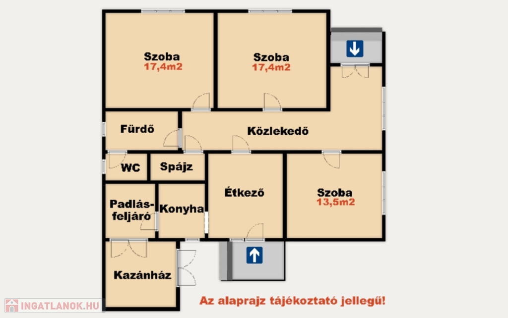 A ház elrendezése praktikus: három külön nyíló szoba, konyha, étkező, fürdőszoba, külön WC, spájz, közlekedő és kazánház található benne.
