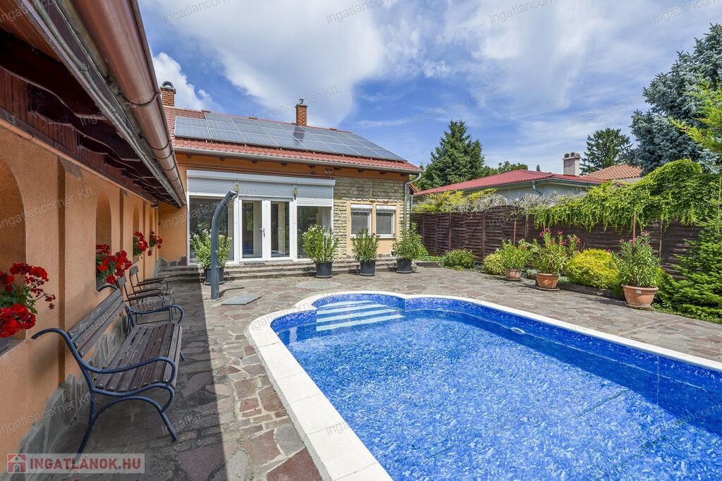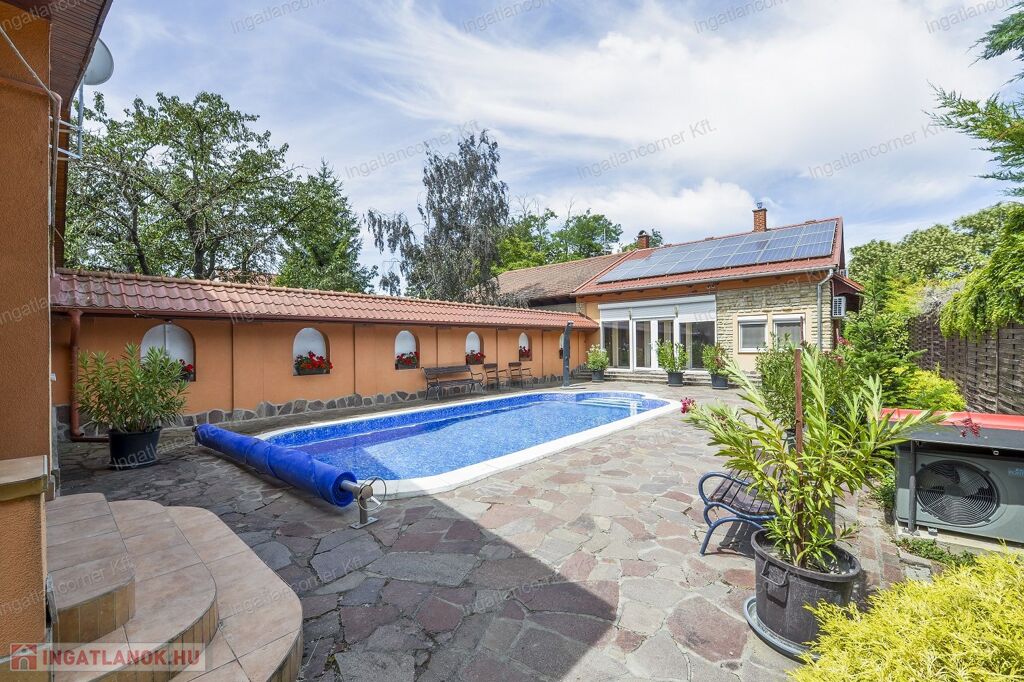 A főépület és a melléképületek között található még egy 8x4 méteres hőszivattyúval fűtött, zsalukőből épített, fóliázott, automata vegyszerezésű, külön gépészeti aknával ellátott MEDENCE is melyet terméskővel burkoltak körbe és napozóterasszal láttak el.
