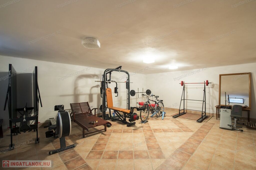 A garázs után találjuk a fedett teraszos melléképületet, melyben két, mindennel felszerelt, önálló lakrész lett kialakítva. A melléképületeket és a főépületet egy hosszú épület köt össze, melyben a 110 m2-es konditerem és szuterén található.