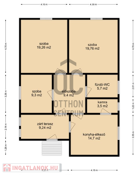- A 90 m2-es házban 2 egész és egy félszoba, konyha-étkező, fürdőszoba-WC, előszoba, kamra, zárt terasz került kialakításra.