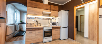 -helyiségek: 3 hálószoba, nappali, tágas konyha–étkező, WC-kézmosó, fürdőszoba,