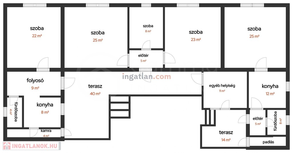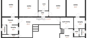 - jelenlegi elosztás: 6 szoba, 2 konyha, 2 fürdőszoba, kamra.