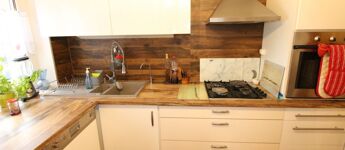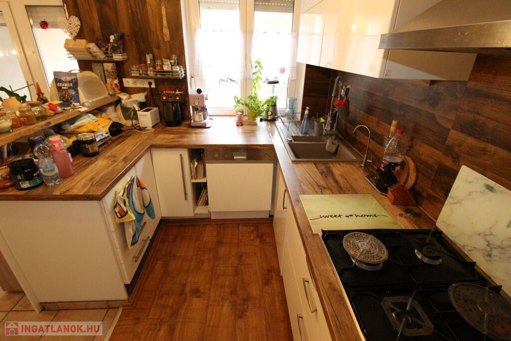 A konyhában egyedi gyártású konyhabútor, beépített háztartási gépekkel felszerelve, elektromos sütő, tűzhely, páraelszívó és mosogatógép.