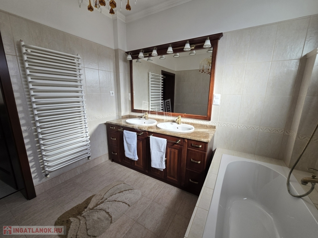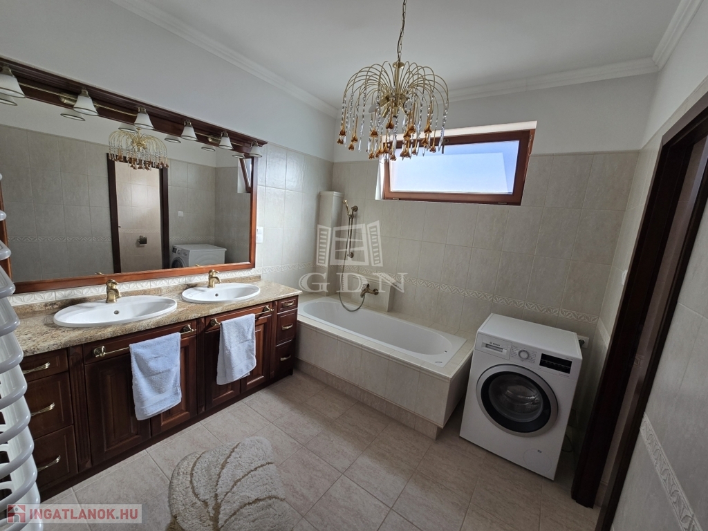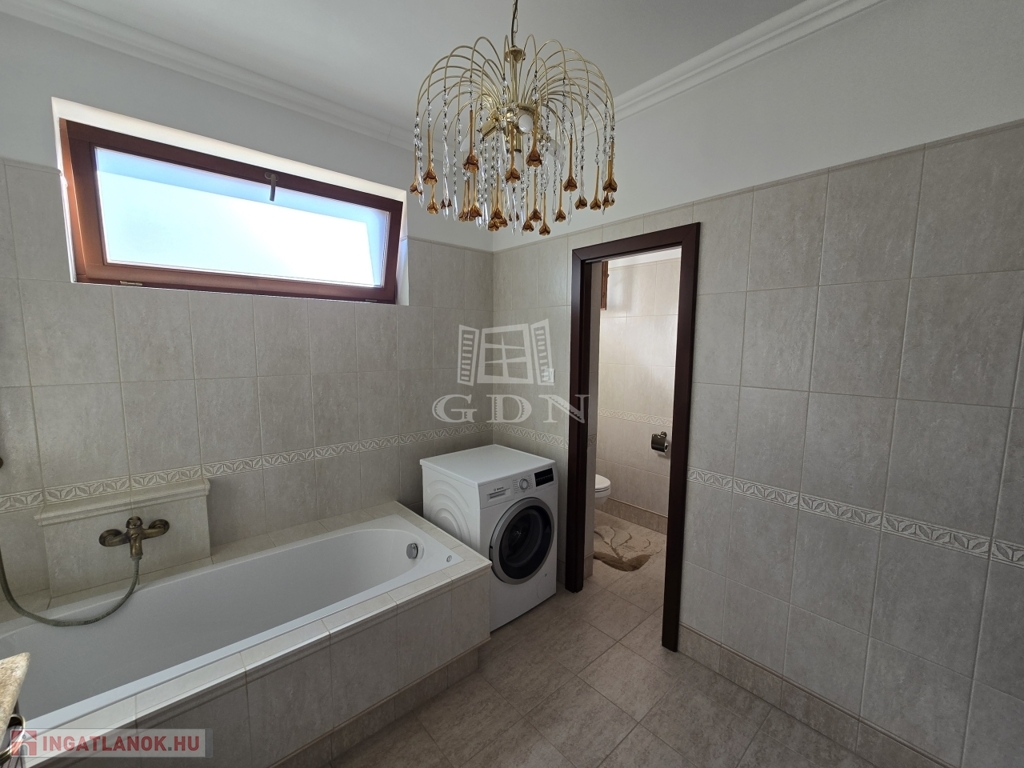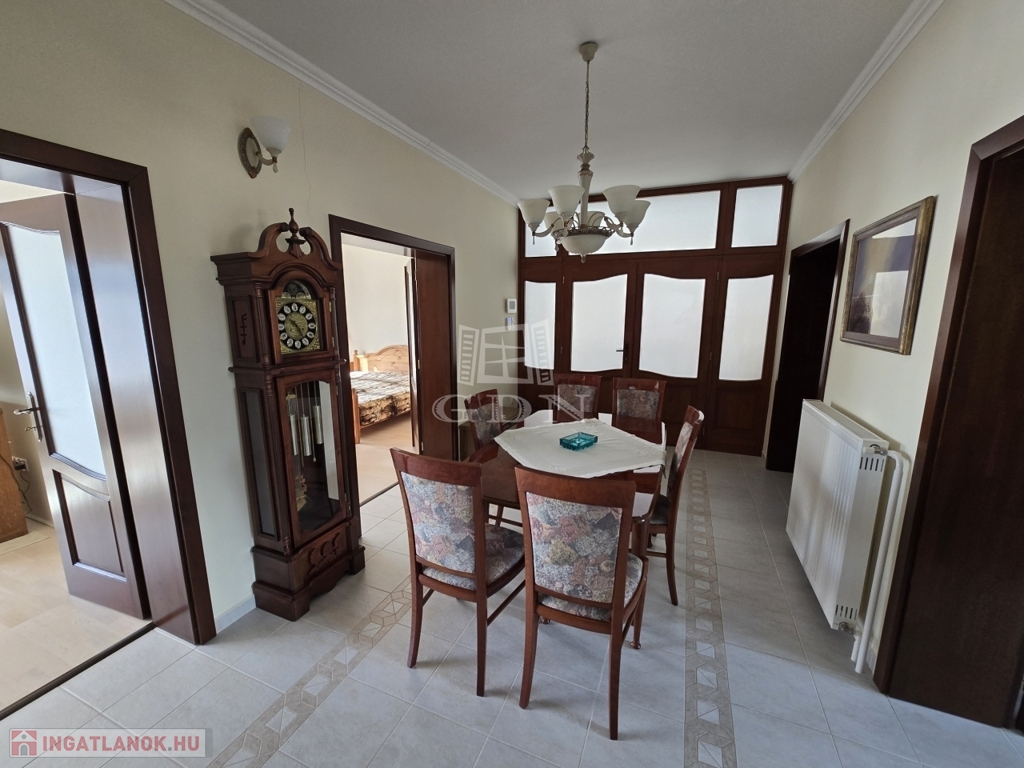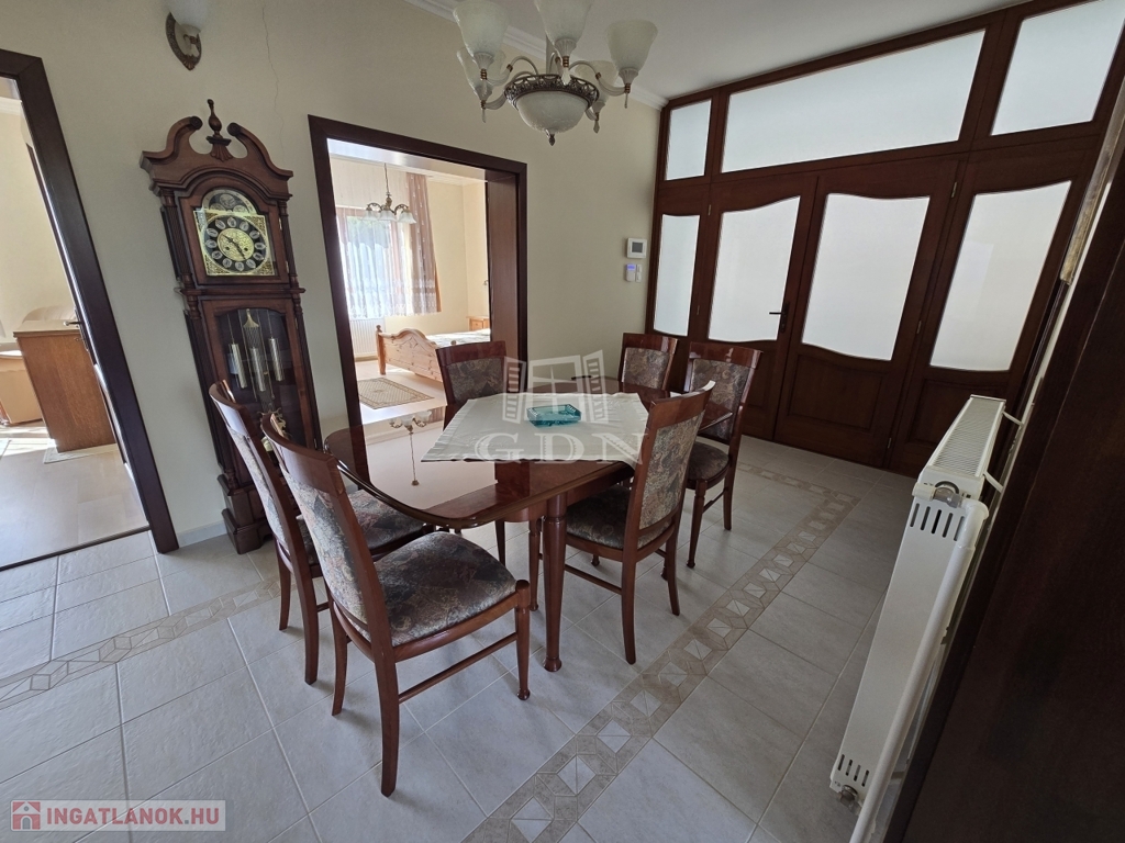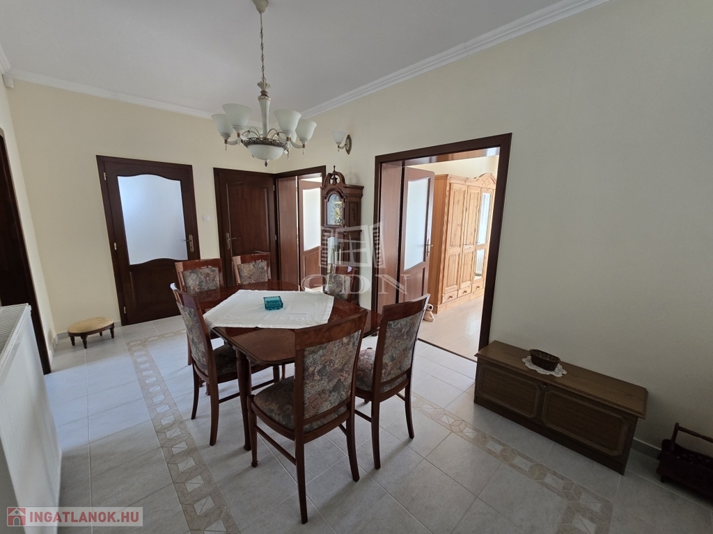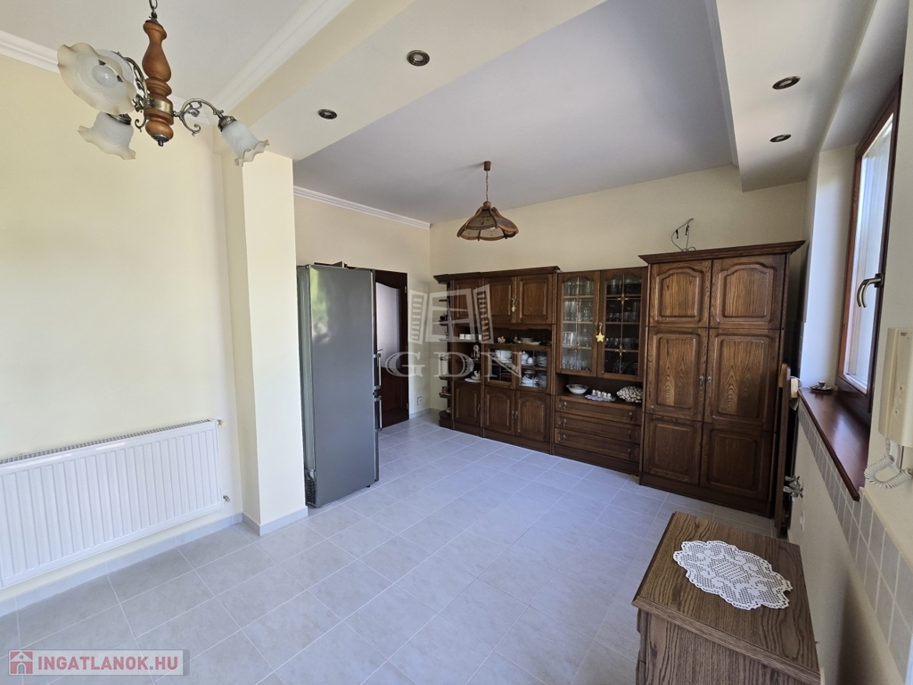 A földszinti lakótér három tágas szobából, egy világos, nagy méretű konyhából, kamrából, több mint 15 m²-es étkezőből, fürdőszobából, külön WC-ből, valamint előszobából áll. A helyiségek elosztása átgondolt és praktikus, a ház kiváló fényviszonyokkal rendelkezik, minden helyiség tágas és világos.