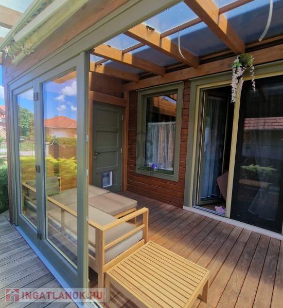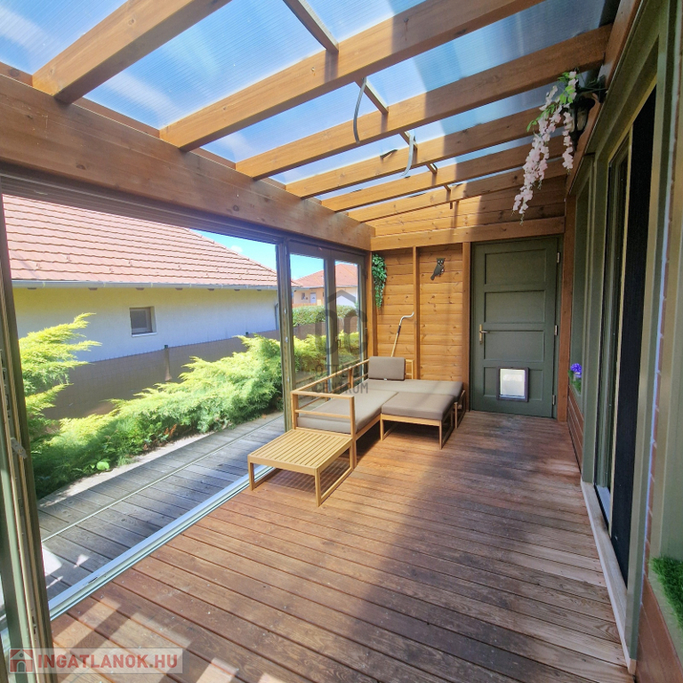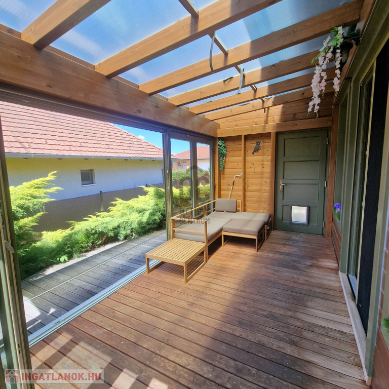 A tágas nappaliból lehet kimenni a fedett teraszra, ami egyetlen mozdulattal téliesíthető. Ide egy ajtón át is be lehet jönni az udvarról, és ha van házi kedvenc, akkor ő is tudja használni a rajta lévő kutya ajtót.