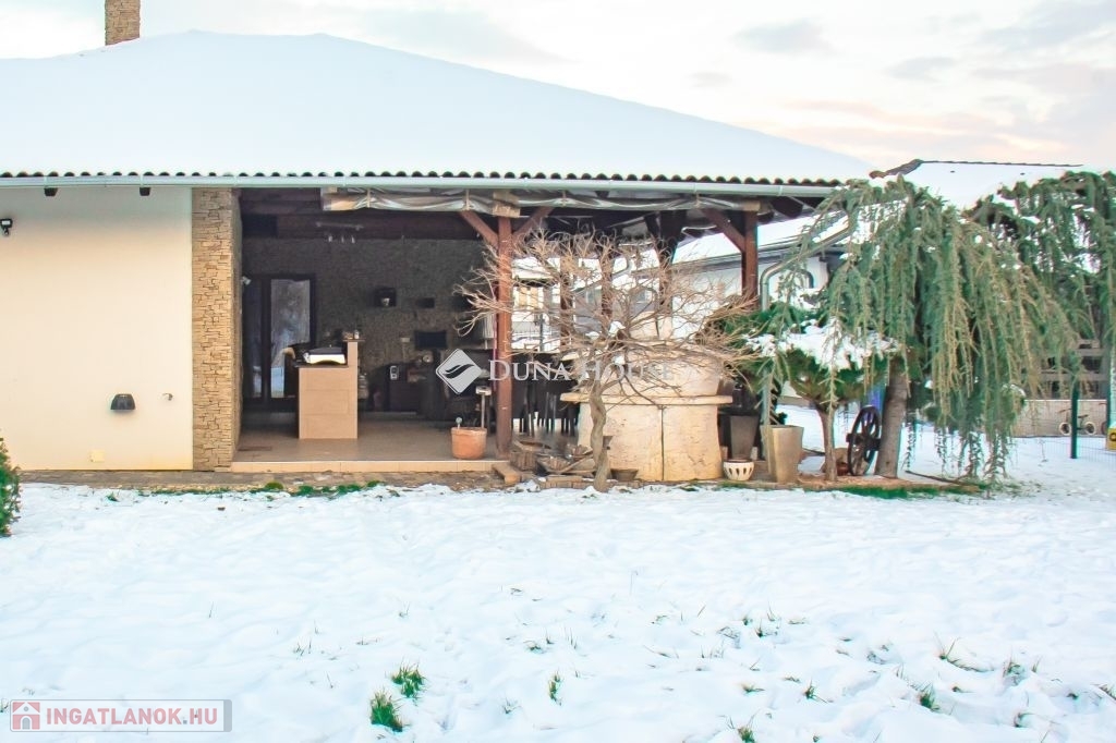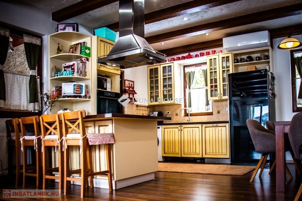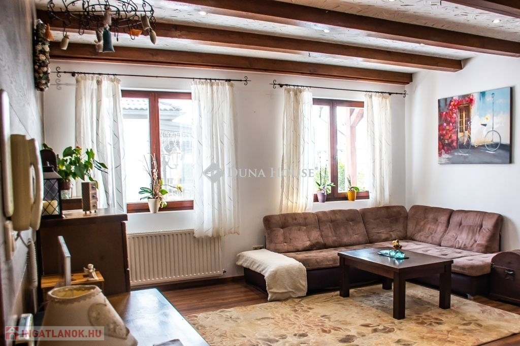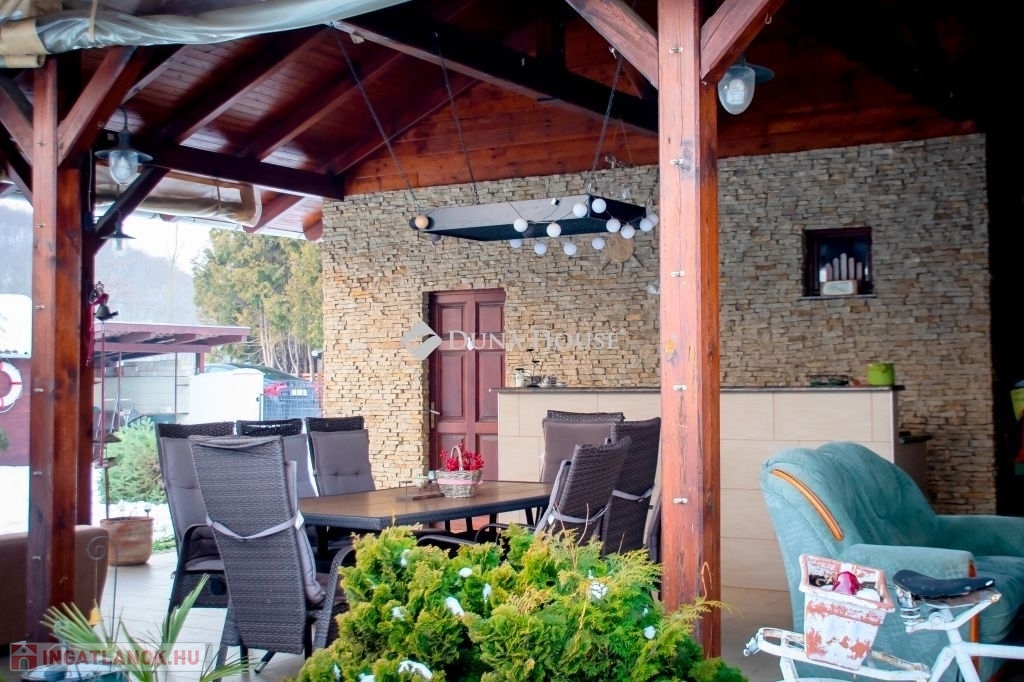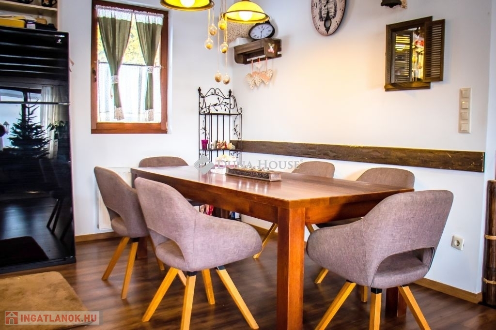 Zalagerszegtől 8 percre, Nagypáliban eladó ez a 2013-ban épült családi otthon 868m2-es saroktelken.A modern építészeti technológia mellett a belső stílusra a rusztikus báj, anyaghasználatára a természetes anyagok alkalmazása jellemző, fa, kő, tégla. A lényeg a kényelem, ahová egyszerűen csak jó hazamenni.A lakótér 109,5m2, melyben egy tágas nappali-konyha-étkező és 3 külön nyíló hálószoba kapott helyet. A fürdőszobában kád és zuhanyzó is beépítésre került. A pakolást egy gardróbhelyiség és a konyhából nyíló kamra segíti.A D-Ny-i tájolású nappaliból jutunk ki a hatalmas fedett teraszra és a kertbe, ahol az öntözőrendszer segítségével könnyedén gondozhatjuk a növényeket. A terasz mérete ideális nagyobb családi vagy baráti társaságok fogadására is, melyet akár hűvösebb időben is használni lehet, mivel oldalai lezárhatók fóliával.A parkolás akár több autóval is megoldott a garázson kívül is.Műszaki adatai:-2013-ban épült-Falazata 35x100x25 cm Thermo-Block rendszer-A külső és belső nyílászárók fából készültek-A telek 868m2-Alapterület 109,5m2 lakótér + 32,5 garázs + 58,87m2 fedett terasz-A tetőn elhelyezett 6,1KWh napelem biztosítja a folyamatos áramellátást (Havonta átlagosan 700-900 kWh-t termelhet, az évszaktól függően.)-A fűtést egy elektromos kazán biztosítja, mely a napelemre van kötve. Hőleadás radiátorokon keresztül.-A garázsban elhelyezett 120l-es Wi-fis Ariston bojler adja a melegvizetAz ingatlannak rendkívül alacsony a fenntartási költsége. Gáz nincs az épületben, de ráköthető igény esetén, a napelem szinte az egész ház áramellátását biztosítja, a víz pedig fogyasztás alapján fizetendő. A környék csendes, biztonságos családiházas övezet. Nagypáli Zalaegerszegről 8 perc alatt könnyedén elérhető, így a reggeli munkába/iskolába járás nem lehet gond. Ha felkeltette érdeklődését az ingatlan és megtekinteni személyesen is, kérem keressen elérhetőségeimen időpnt egyeztetés miatt.Hitelügyintéző kollégánk díjmentesen navigálja ügyfeleinket a döntéstől a vásárlásig.