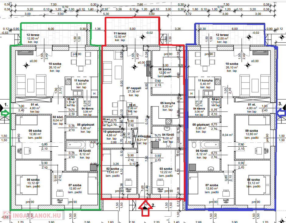 A lakás : 101.54nm A saját udvar , ahol több autó számára is kialakításra került parkoló : 448nm