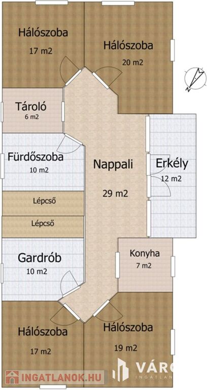 • Földszint: Fedett terasz, előtér, gardrób, vendég mosdó, nagy nappali teraszkapcsolattal, hálószoba, fürdőszoba, két szoba, konyha-étkező.