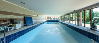 300 nm-es, zárt, 6×20 m-es medence, amely nyáron napkollektorral, télen gáz hőcserélős rendszerrel fűtött