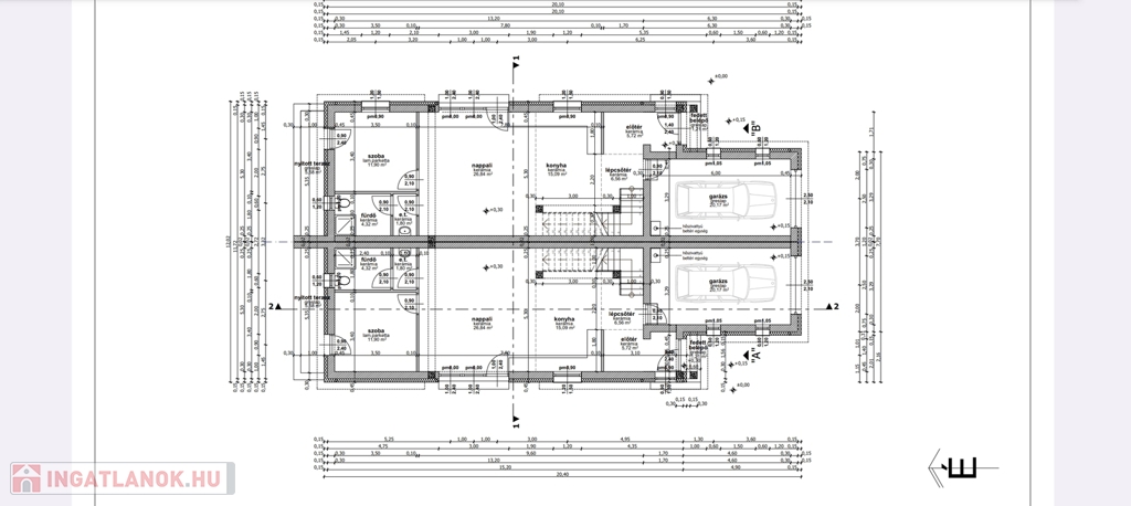 A földszinten: konyha-étkező-nappali (42m2), előtér, lépcsőház, 11,9m2-es szoba, zuhanyzó-wc-vel, L alakú nyitott terasz és egy burkolt 20m2-es garázs található.