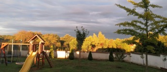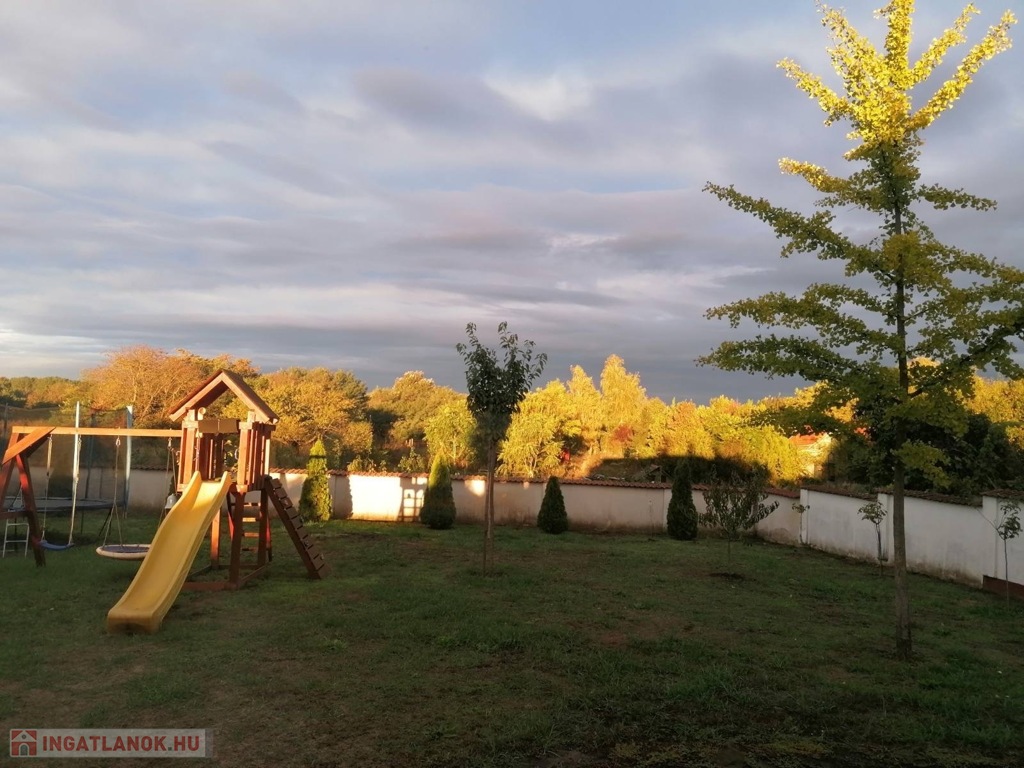 A telek adottságai:Az 1014 m²-es telek gondozott, részben térkövezett, részben parkosított és díszfákkal beültetett. A kert kényelmét automata öntözőrendszer, egy külön filagória, játszótér és egy plusz fedett autóbeálló növeli.