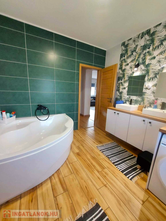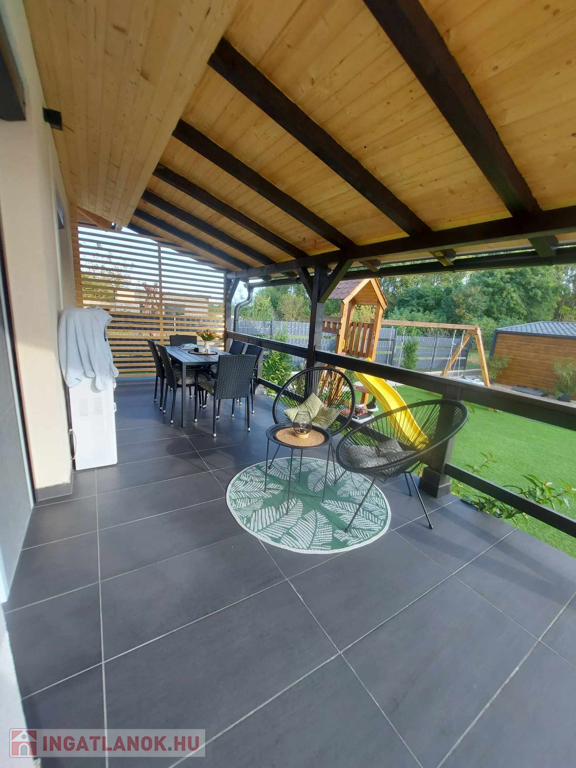 Az ingatlan 30-as Porotherm okos téglából épült, 15 cm-es homlokzati szigeteléssel, és cserép fedésű tetőszerkezettel. A családi házban 4 külön nyíló szoba, étkező, amerikai konyhás-nappali, 2 fürdőszoba-WC vel, kamra, gardrób, és előtér helységek találhatók. A ház központi részén található teraszkapcsolattal rendelkező nappaliba beépítésre került egy 4,5 KW-os hűtő-fűtő klíma, és egy 14 Kw-os modern Krakti kandalló amely hangulatos pillanatokat teremt. A napfényes egyedi gépesített konyhabútorral és konyhaszigettel felszerelt konyha-étkező, kapcsolódik a nappalihoz, és egy kamra tartozik hozzá. A tágas 9 nm-es fürdőszobában sarokkád, dupla mosdó és WC került beépítésre, a kisebb fürdőszobában épített zuhanyzó, mosdó és WC biztosítja dupla komfortot.