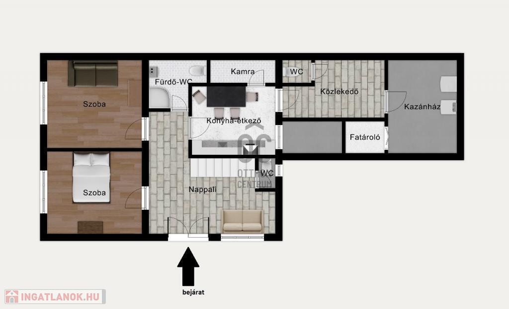 Tágas, élhető belső tér: nappali + 3 hálószoba, konyha-étkező, fürdőszoba-WC és további 2 különálló mellékhelyiség.