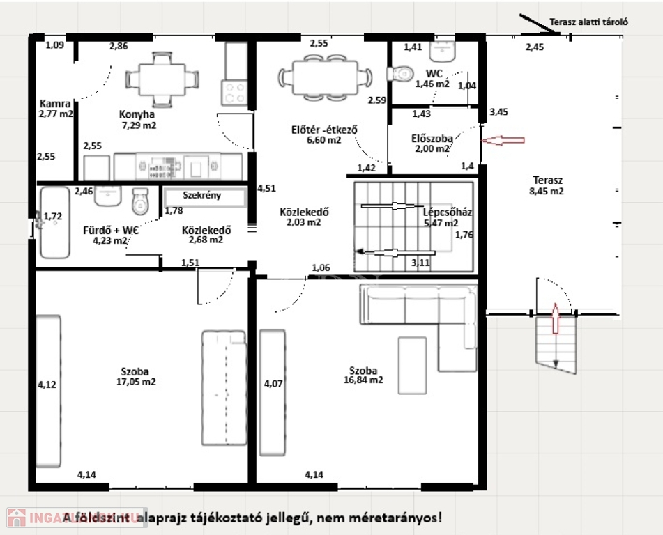 A z ingatlant beépített, üvegezett teraszon keresztül jutunk a földszinti lakótérbe, melynek nettó alapterülete 68,42 m².