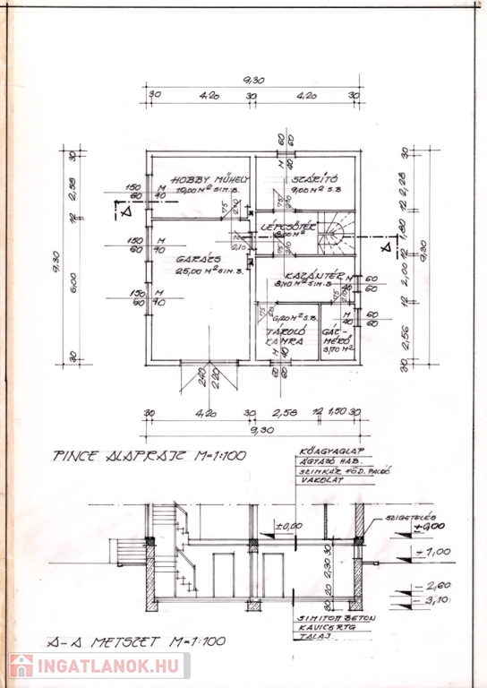 A pince szint 70,3 m², ahol fűtött, 25 m² garázs, hobby szoba, szárítóhelyiség, valamint kazánház, kamra- tároló, és gázmérő helység kapott helyet.