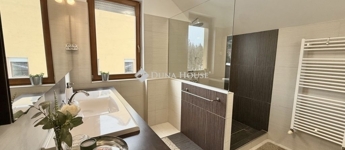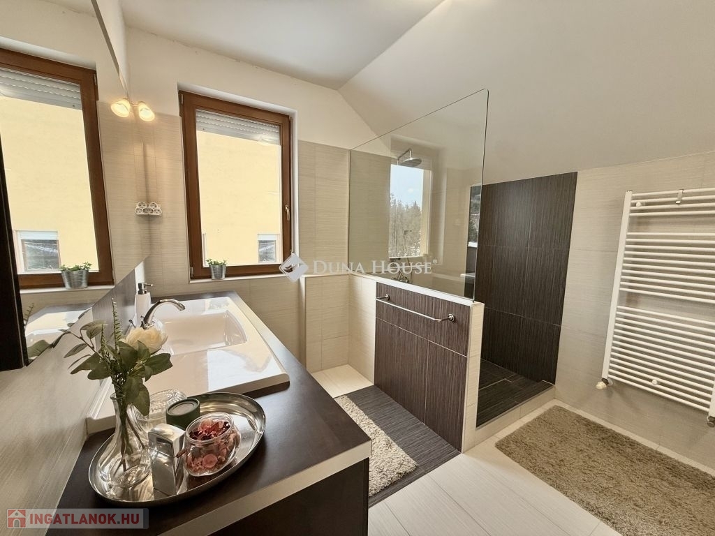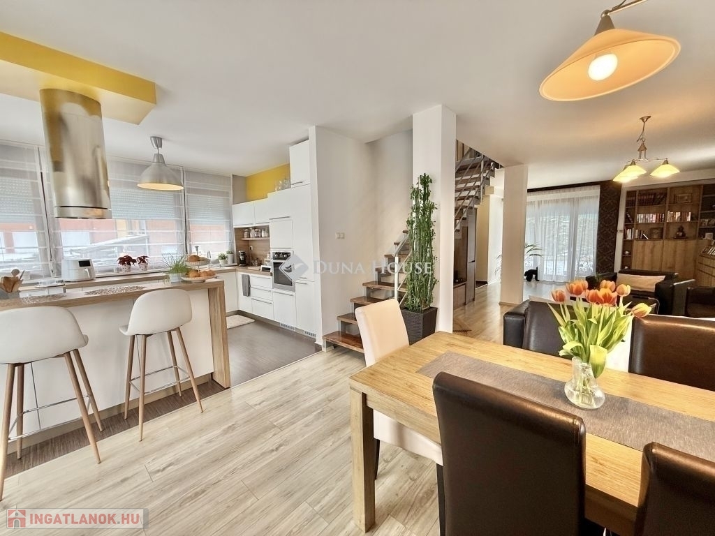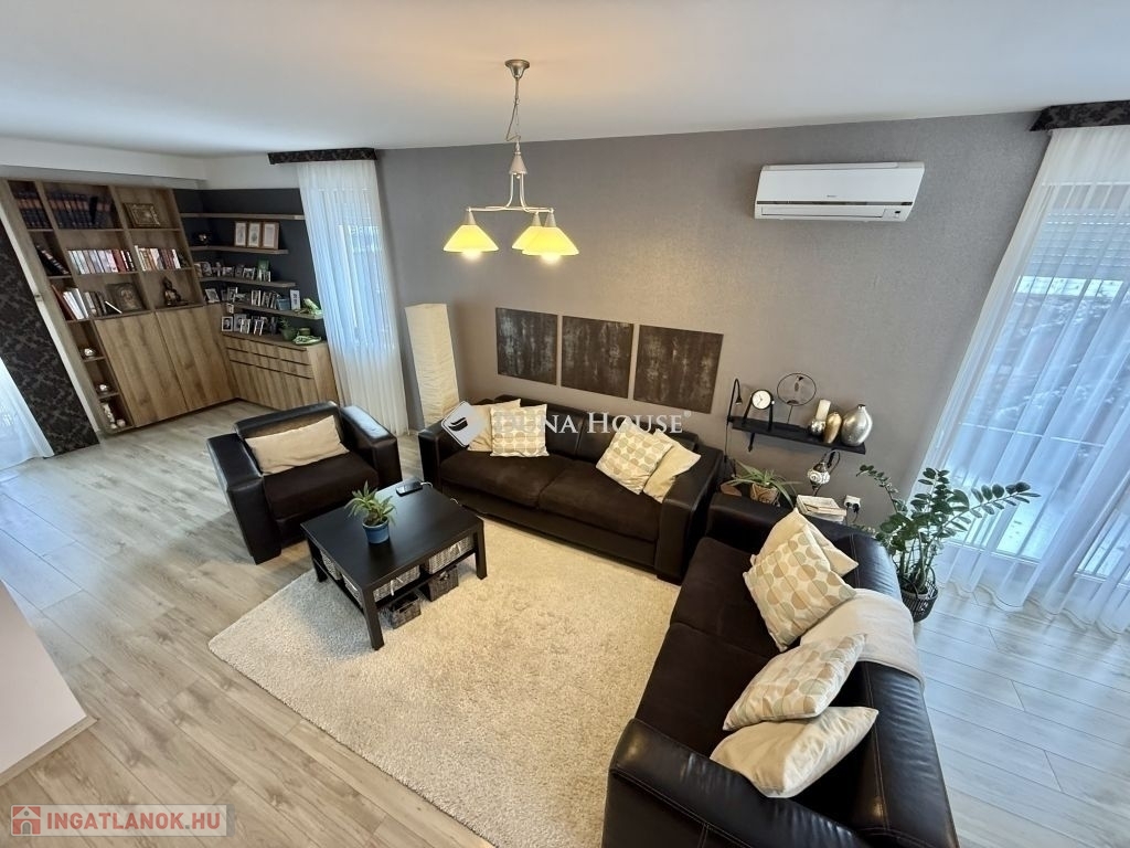Családi ház hangulatú, tágas otthon eladó a csendes, zöldövezeti Donátusban!Pécs egyik legkedveltebb, panorámás részén, Donátusban, a Csoronika dűlőben kínálunk megvételre egy 2010-ben épült társasházi ingatlant, amely kialakításának köszönhetően teljes mértékben családi ház érzetét nyújtja ez a ritka kombináció igazán különlegessé teszi!A 124 m²-es, kétszintes, amerikai konyhás nappali + 4 SZOBÁS otthon ideális választás nagyobb családok számára is. Az ingatlan tágas, világos terekkel rendelkezik, kiváló elosztású és kertkapcsolatos.Alsó szint:-Tágas, napfényes amerikai konyhás nappali-Közvetlen kijárat a parkosított, kertre és fedett teraszra-Egy hálószoba, melyhez saját zuhanyzós fürdőszoba és WC tartozik-háztartási helyiségFelső szint:-3 külön nyíló szoba-Két szobából kijárat a 25 m²-es, panorámás teraszra-Fürdőszoba-Külön WCMűszaki jellemzők:-Kondenzációs gázkazános fűtés-Riasztórendszer-3 db klímaAz ingatlan csendes, nyugodt, kiváló donátusi környezetben található, gyönyörű panorámával tökéletes választás azok számára, akik természetközeli, mégis városhoz közeli otthont keresnek.Igény esetén megvásárolható egy önálló, 17 m²-es garázs, melynek ára: 10.000.000 Ft.Ha egy családi ház hangulatát keresi, de társasházi környezetben, ezt az ingatlant mindenképpen érdemes megtekinteni!